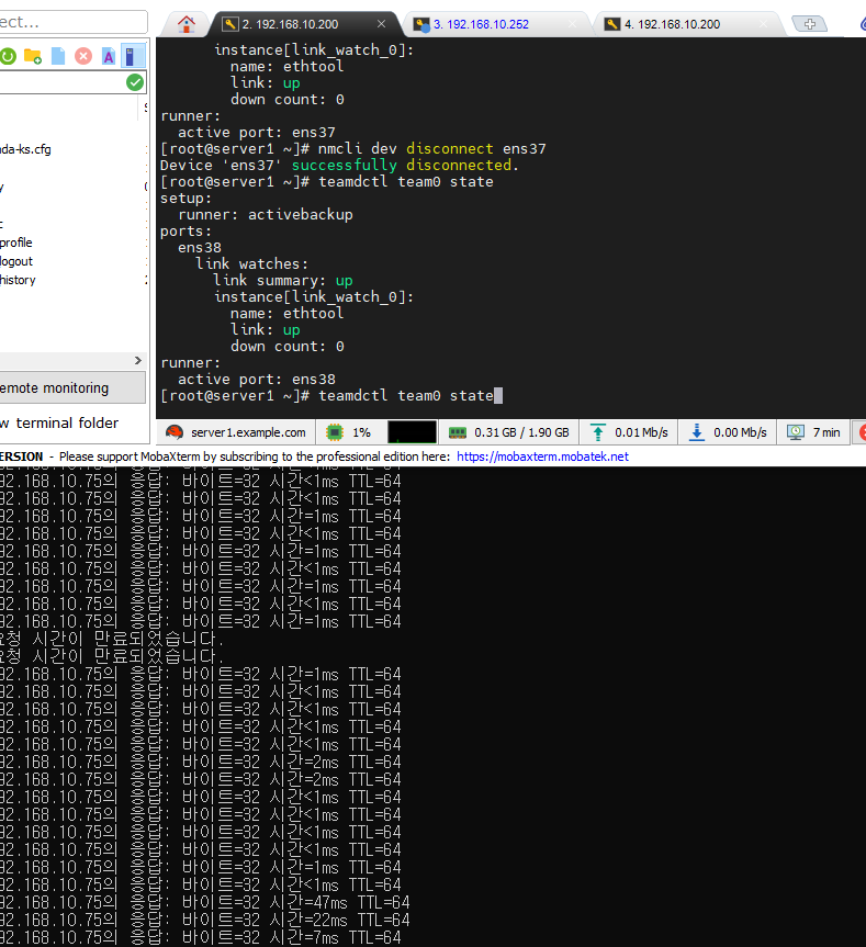 [root@server1 ~]# nmcli conn modify team0 ipv4.addresses 192.168.10.75/24 ipv4.method manual ipv4.gateway 192.168.10.1 ipv4.dns 168.126.63.1