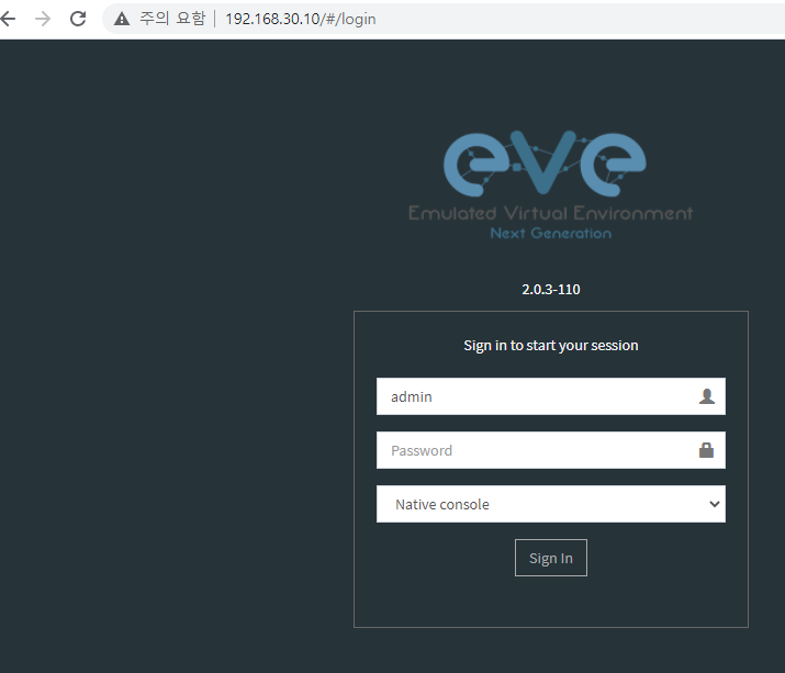 크롬으로 접속 (http://x.x.x.x) https:// 아님.. id/password : admin/eve