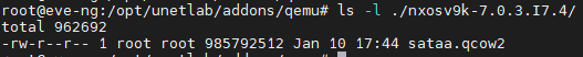 # mv ./nxcp nxosv-final.7.0.3.I7.4.qcow2 ./nxosv9k-7.0.3.I7.4/sataa.qcow2 //sataa로 이름변경
