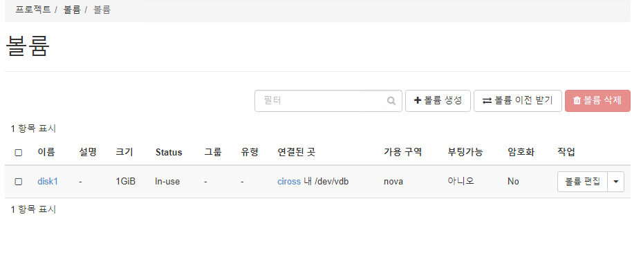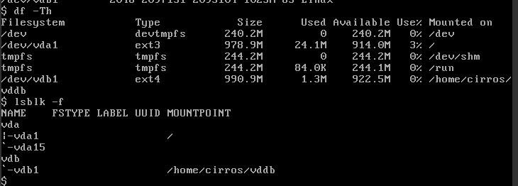 인스턴스 cirros에서 확인 (/dev/vdb 확인)