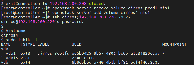 #openstack server add volume cirros_prod1 nfs1