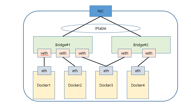 - Docker의 container는 서버의 물리 nic와 별도로 각 container마다 가상 nic가 할당