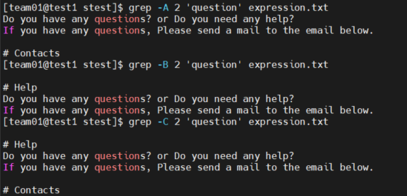 | -C 라인 수, --contest=라인 수 | 패턴이 포함된 라인 전, 후에 선언한 라인 수에 해당하는 라인만큼 앞, 뒤로 라인을 추가하여 보여줌 |