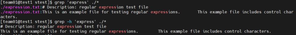 | -h, --no-filename | -H 옵션과 반대로 패턴이 포함된 출력라인의 파일명을 보여주지 않음 |