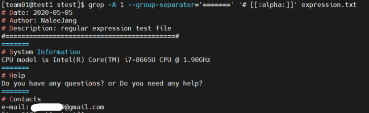 | --group-separator=그룹 구분 기호 | 옵션 -A, -B, -C 와 함께 사용할때 패턴을 기준으로 그룹핑을 해주며, 설정한 그룹구분 기호화 함께 그룹핑을 해줌 |