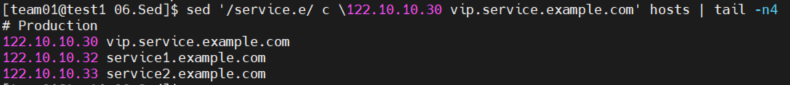 | c \ text | 앞에서 명시된 패턴이 포함된 라인을 text 문자열로 변경 |