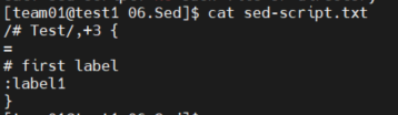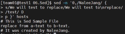 패턴 공간에 포함된 뉴라인을 인식한 후 test가 포함된 라인 삭제