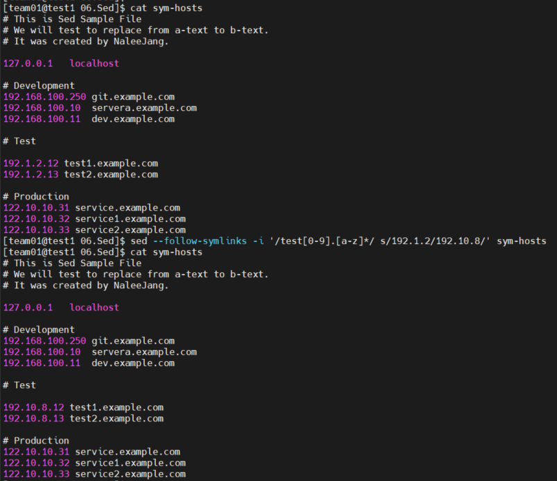| --follow-symlinks | -i 옵션과 함께 사용할 경우 스크립트 실행 결과를 심볼릭 링크자체가 아닌 심볼릭 링크와 연결된 원본 파일에 적용 |
