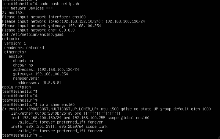 기존에 ens160이 검색 되면 ip_chk 는 1로 확인 되어 else로 빠져 ip가 설정되어 있다고 나옴