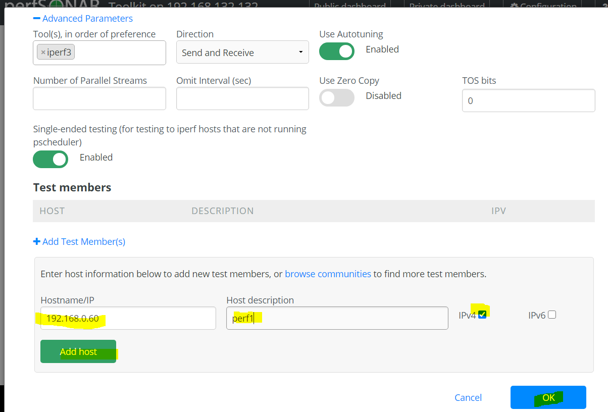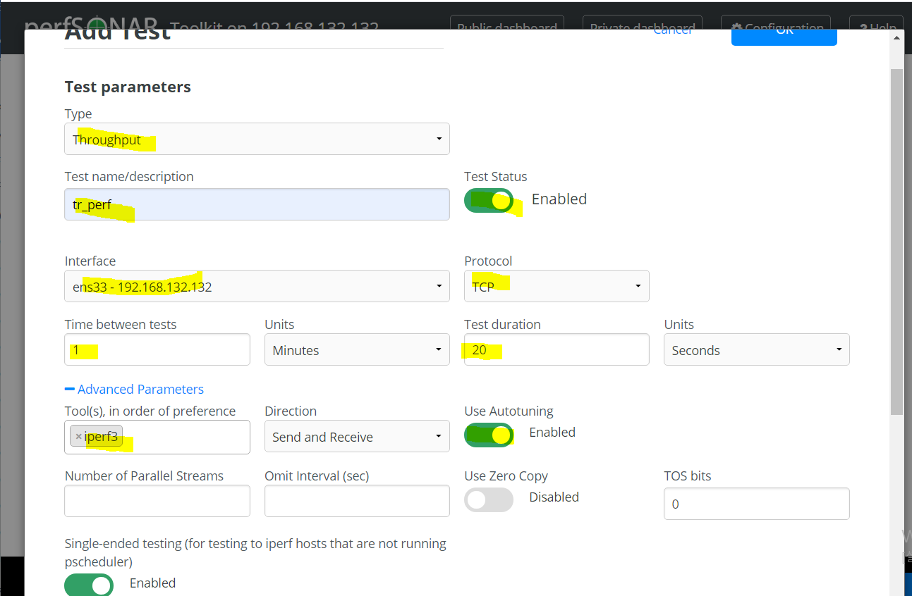 single-ende testing : pscheduler할 서버가 없으면 local 에서 하겠다는 것. (저는 리소스가 없어 enable함.)